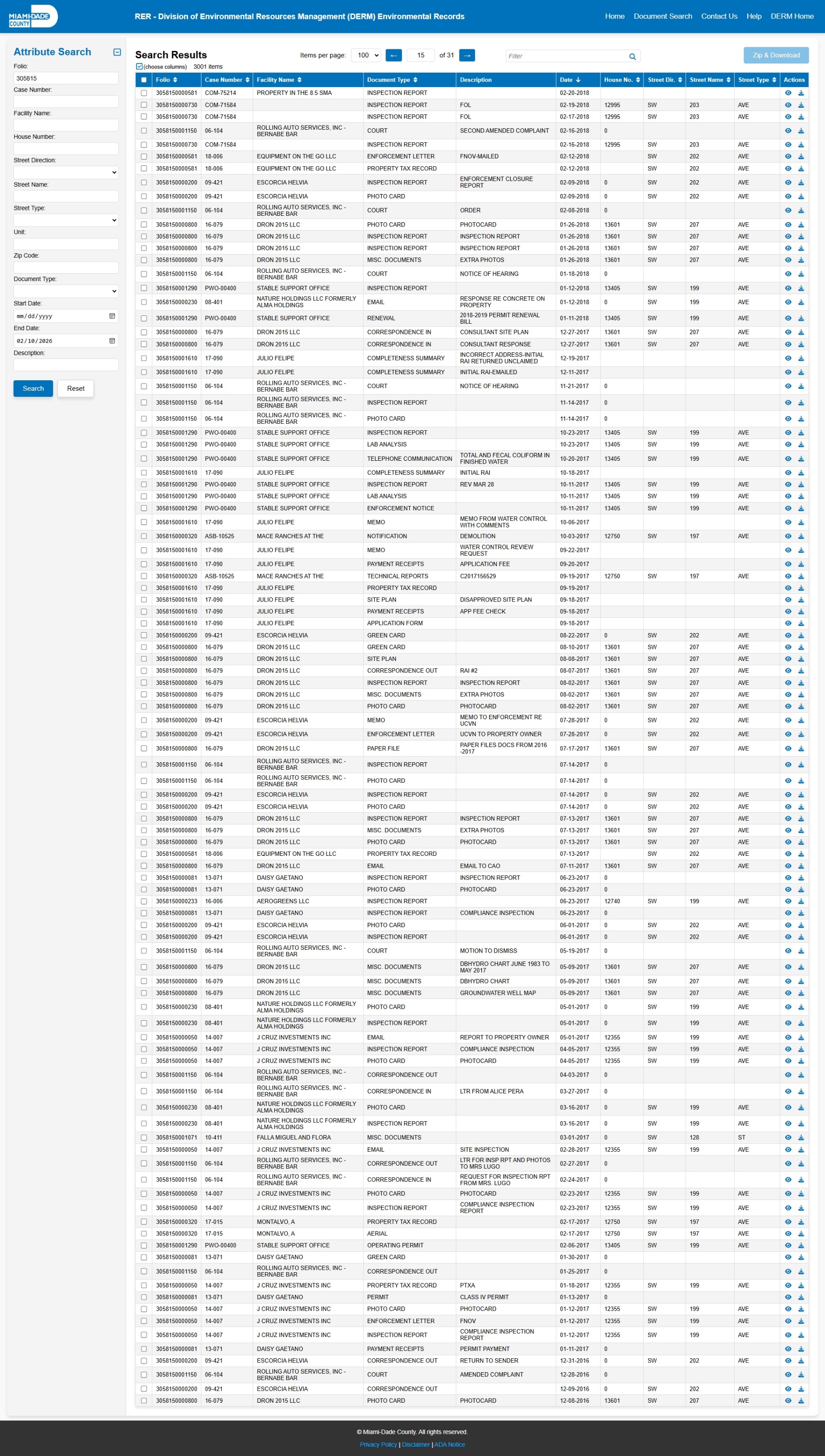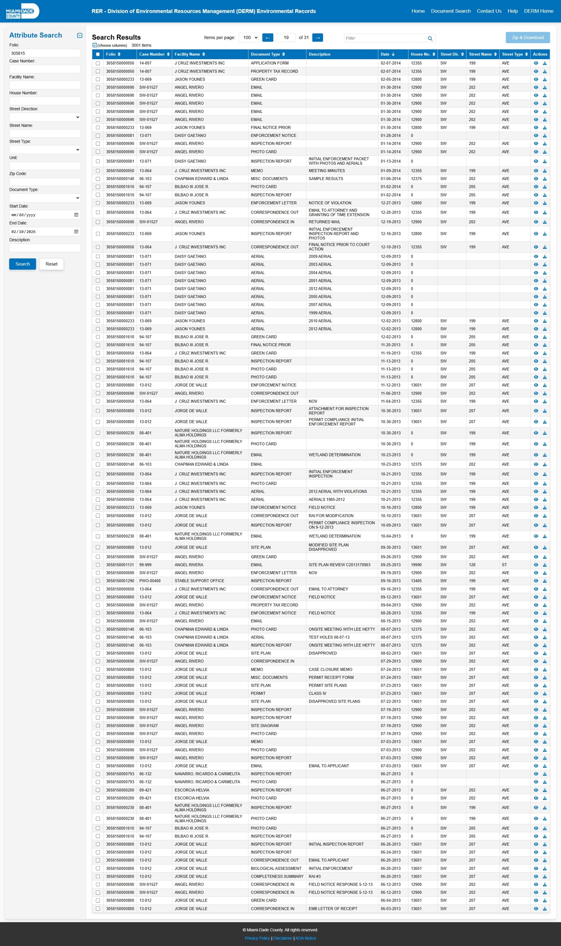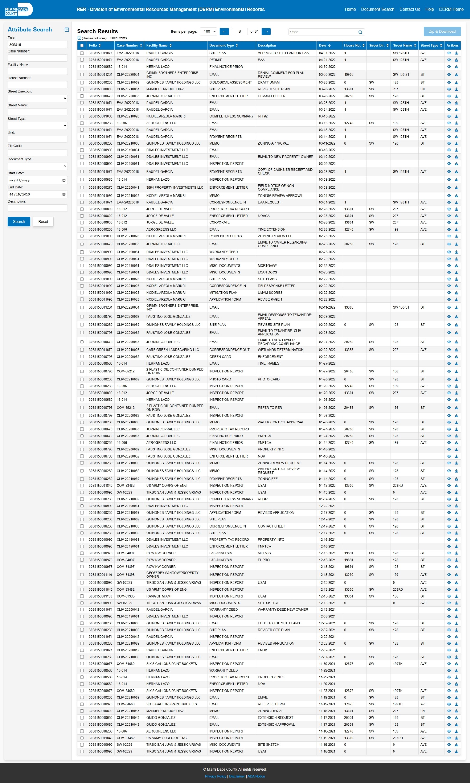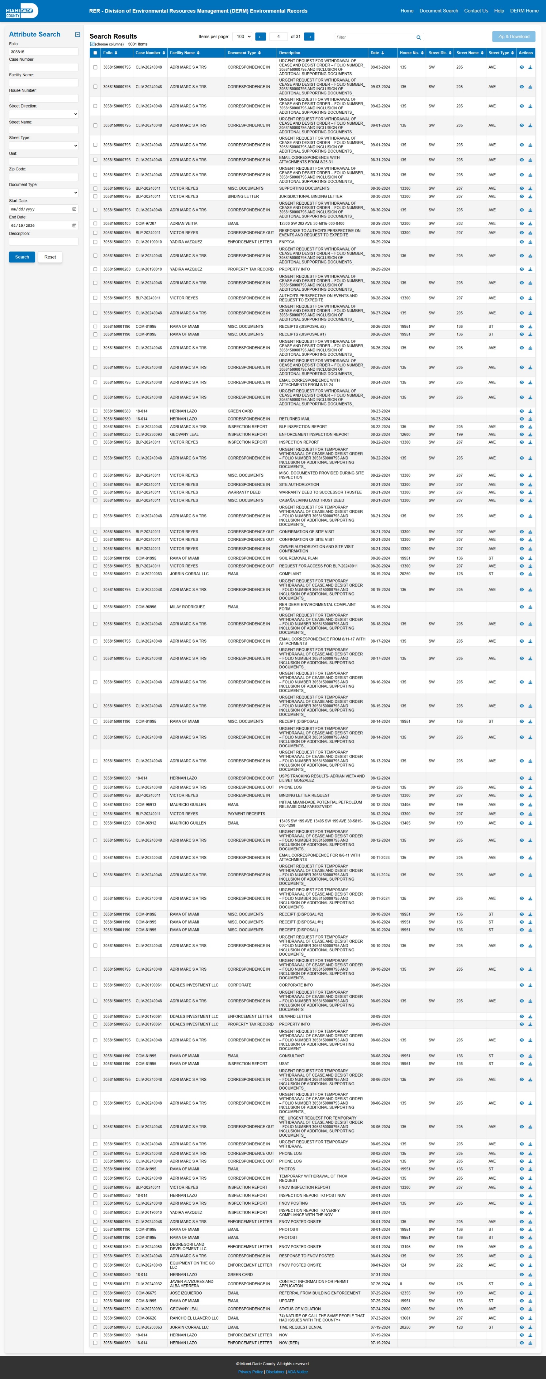 At the time of access, the DERM-RER portal represented the responsive record set as: