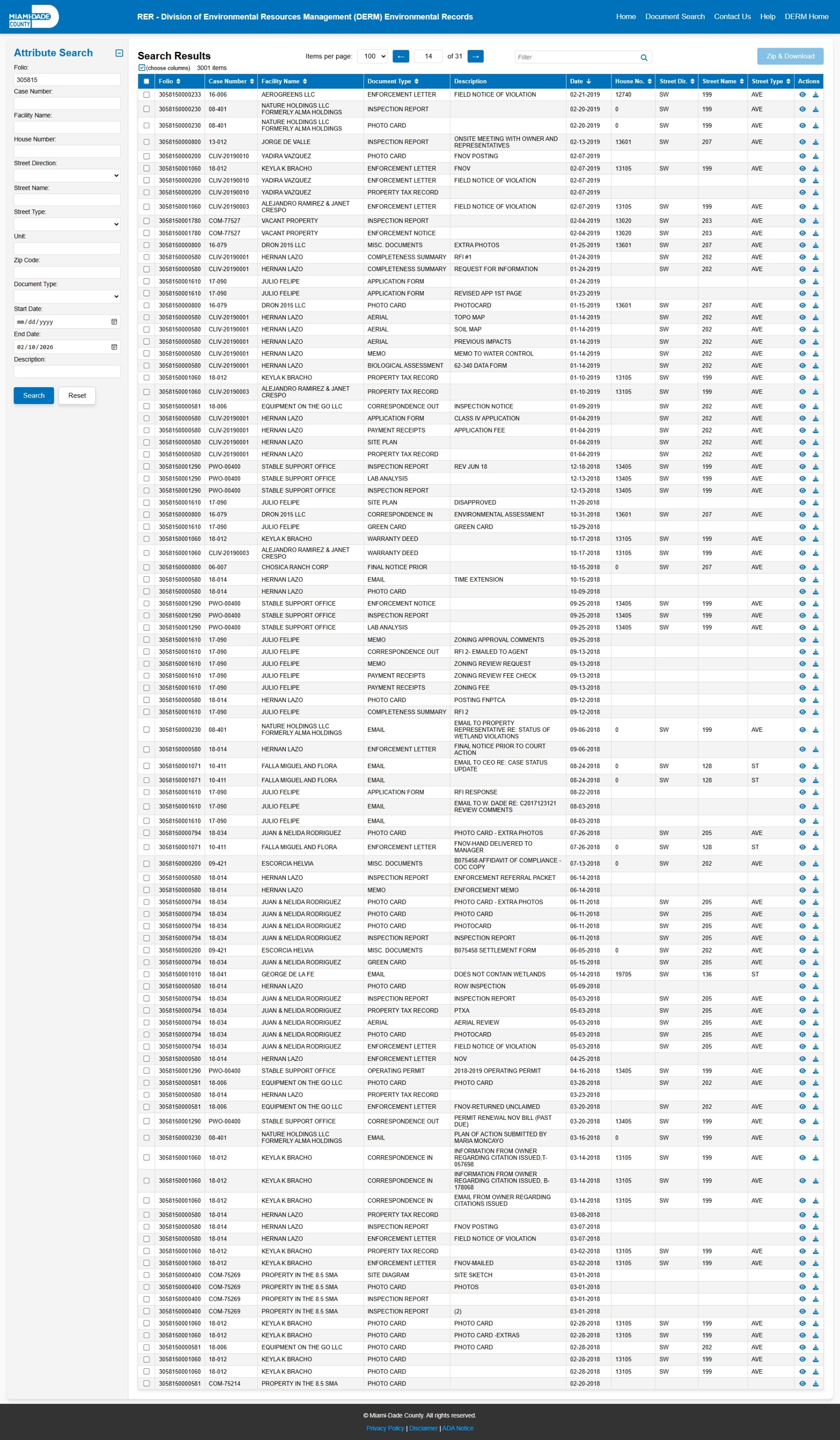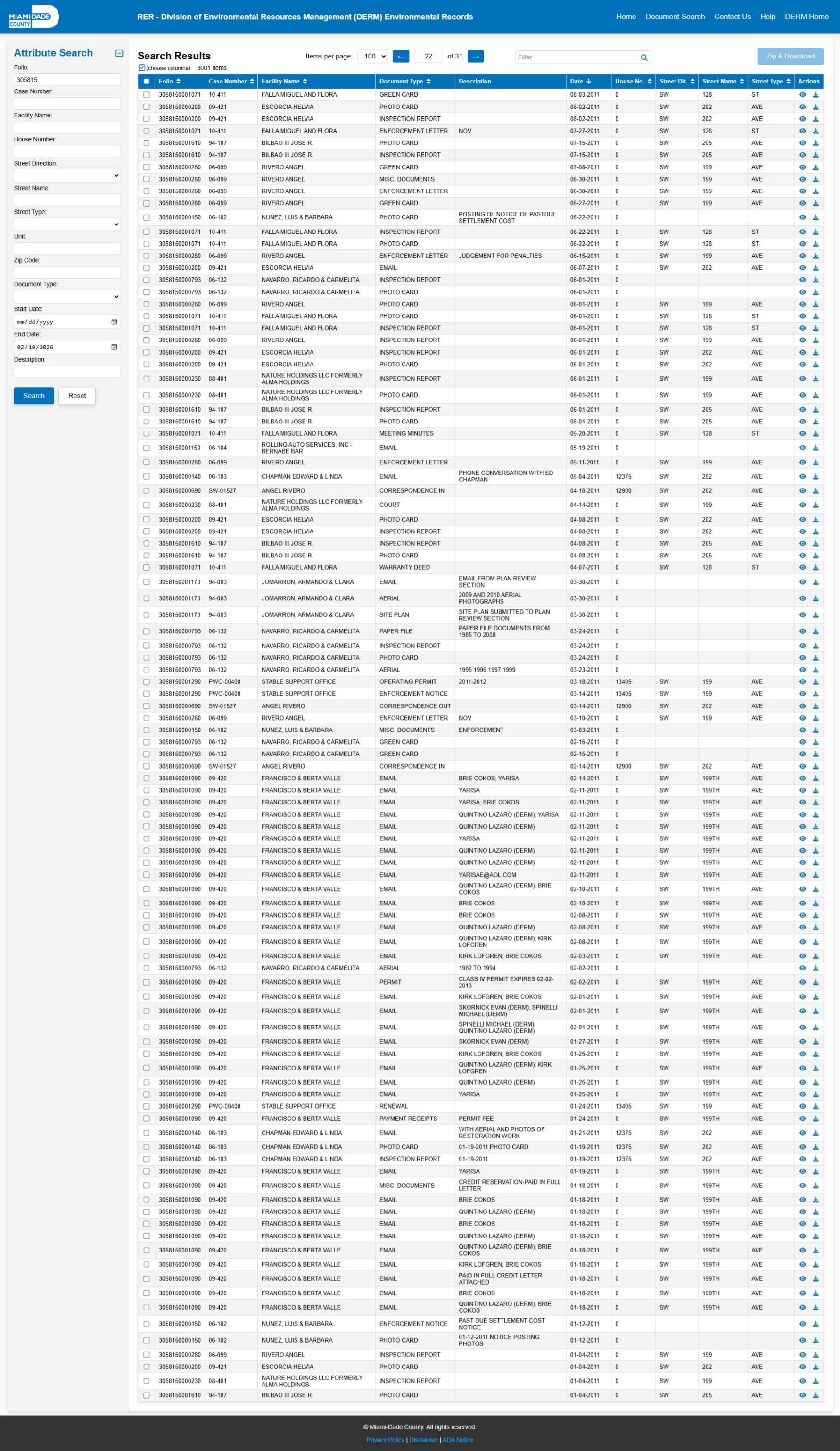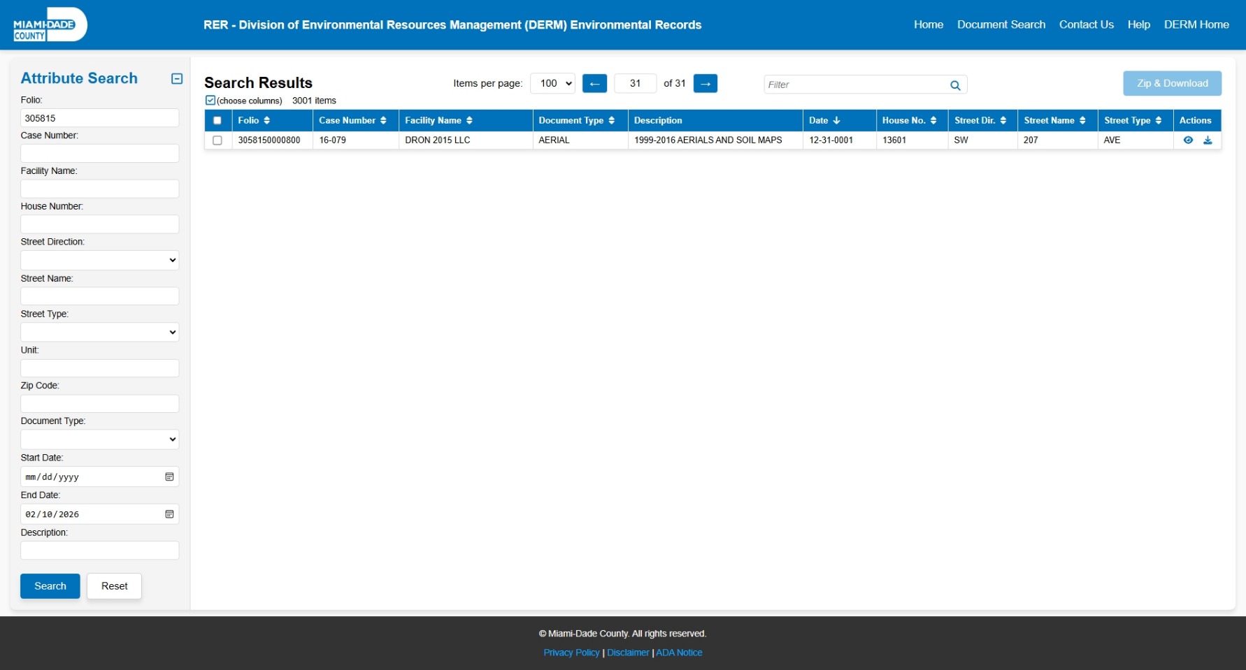 At the time of access, the DERM-RER portal represented the responsive record set as: