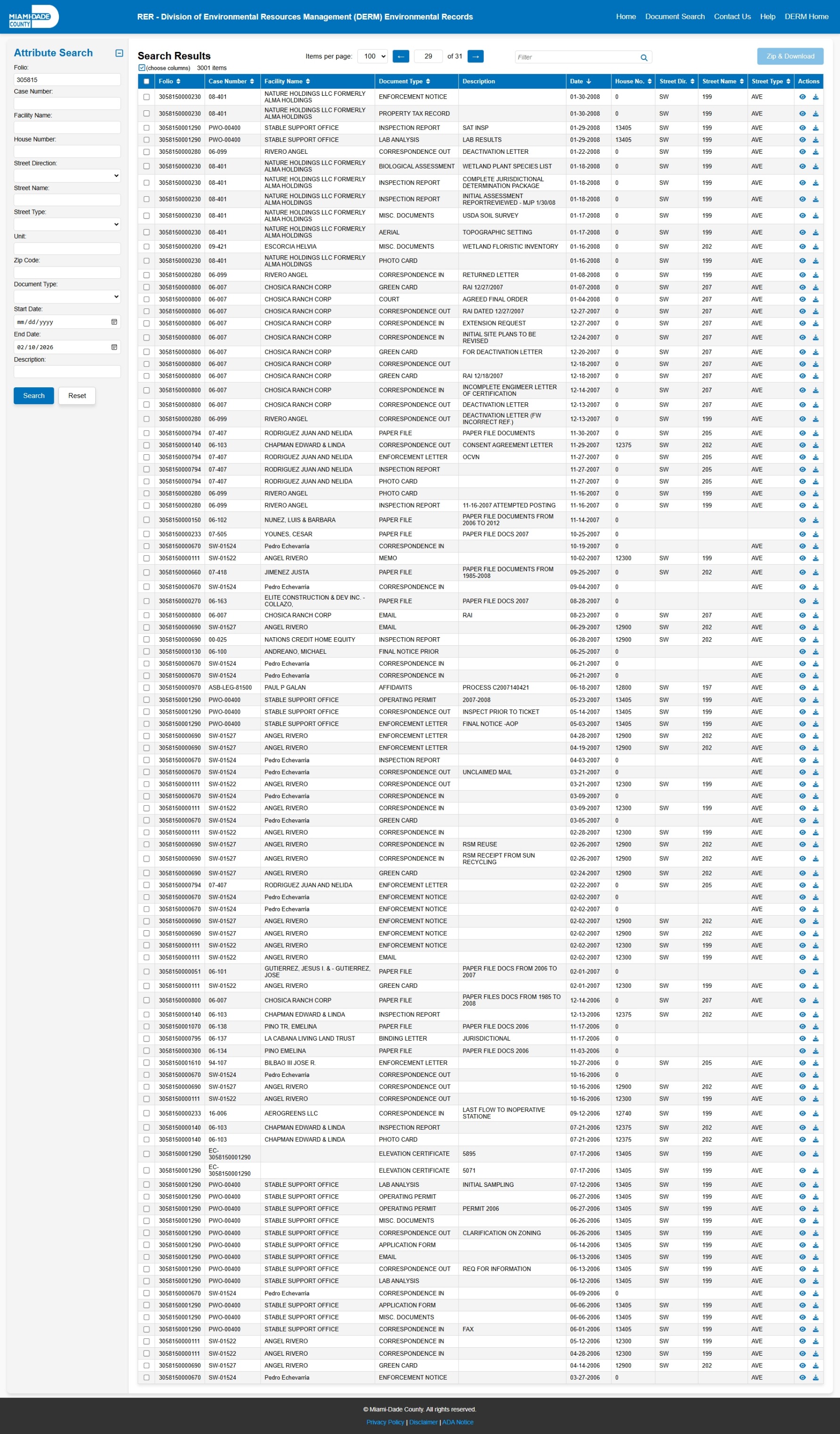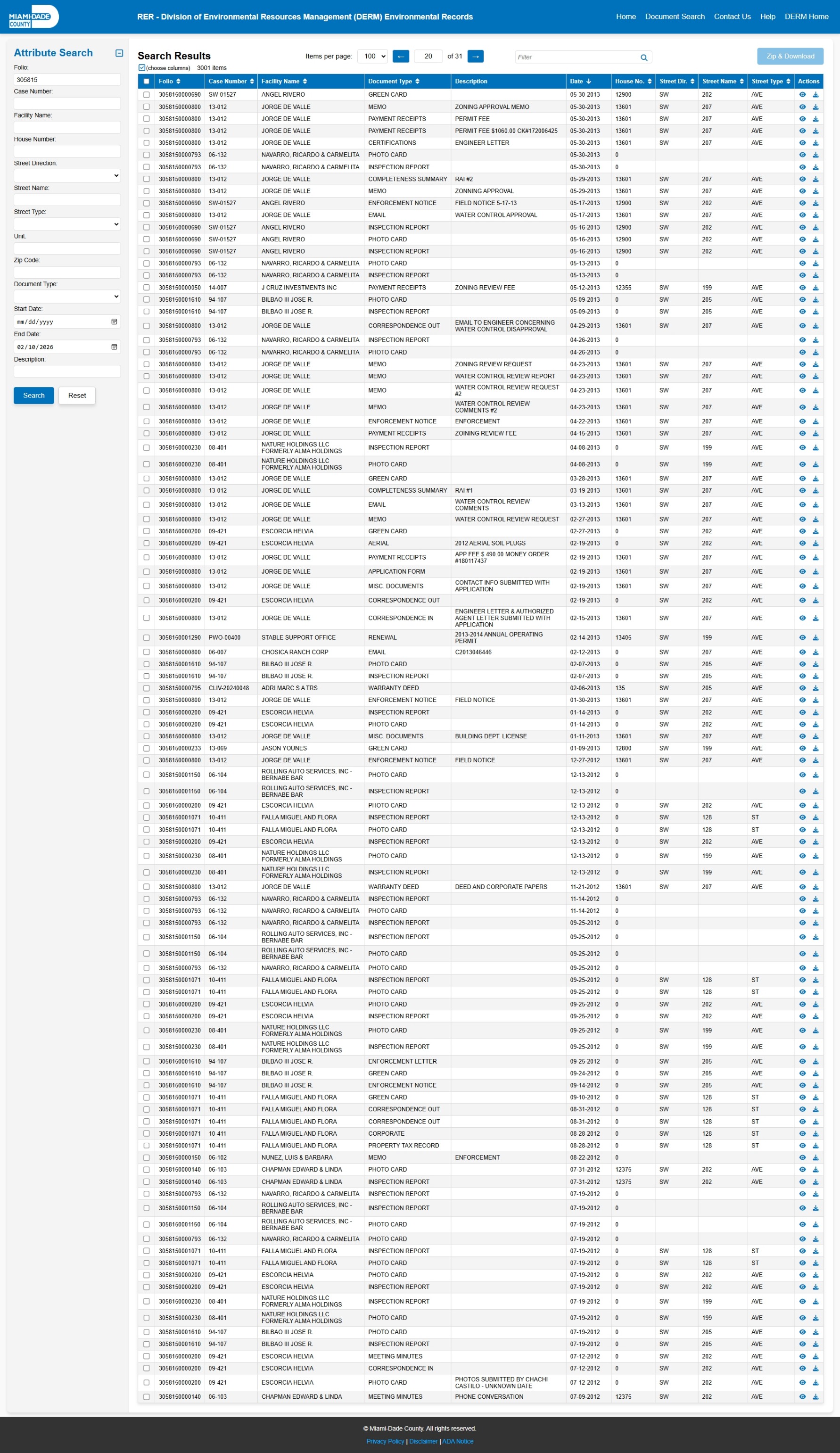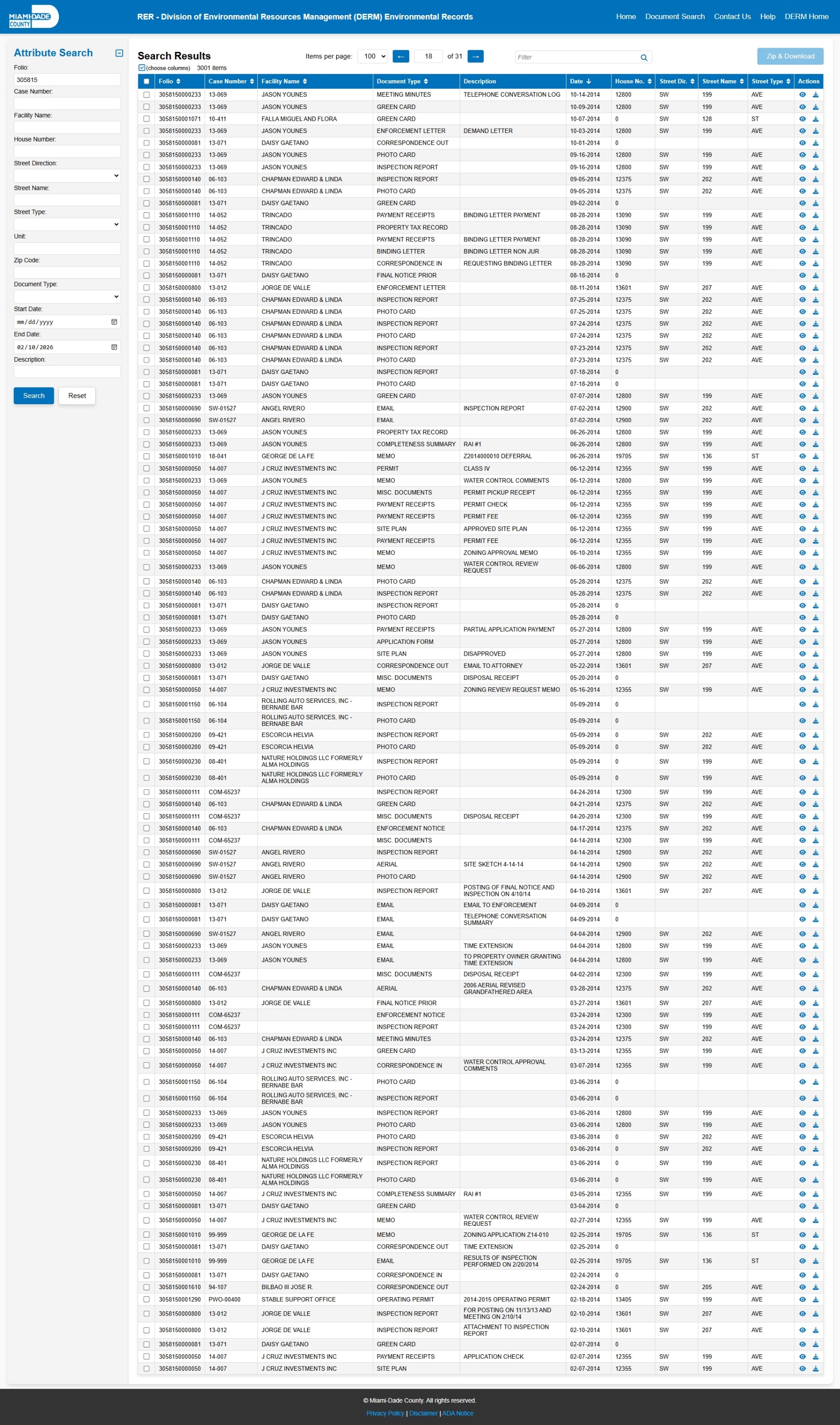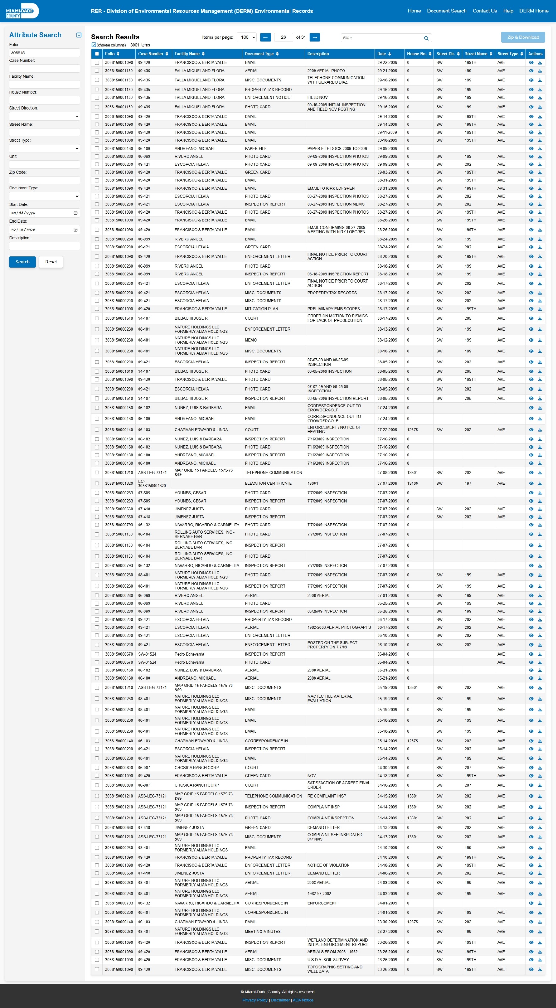 At the time of access, the DERM-RER portal represented the responsive record set as:
