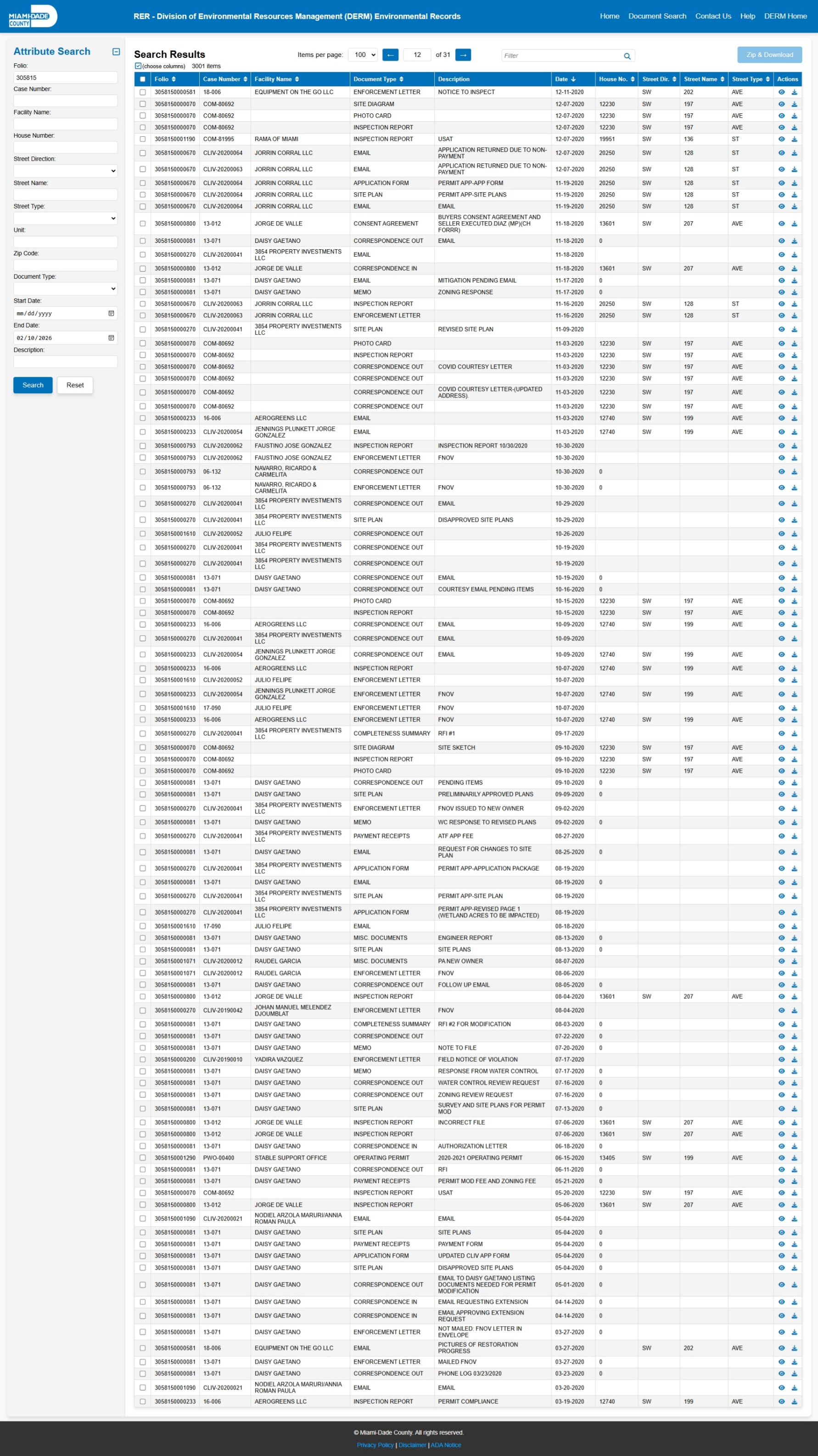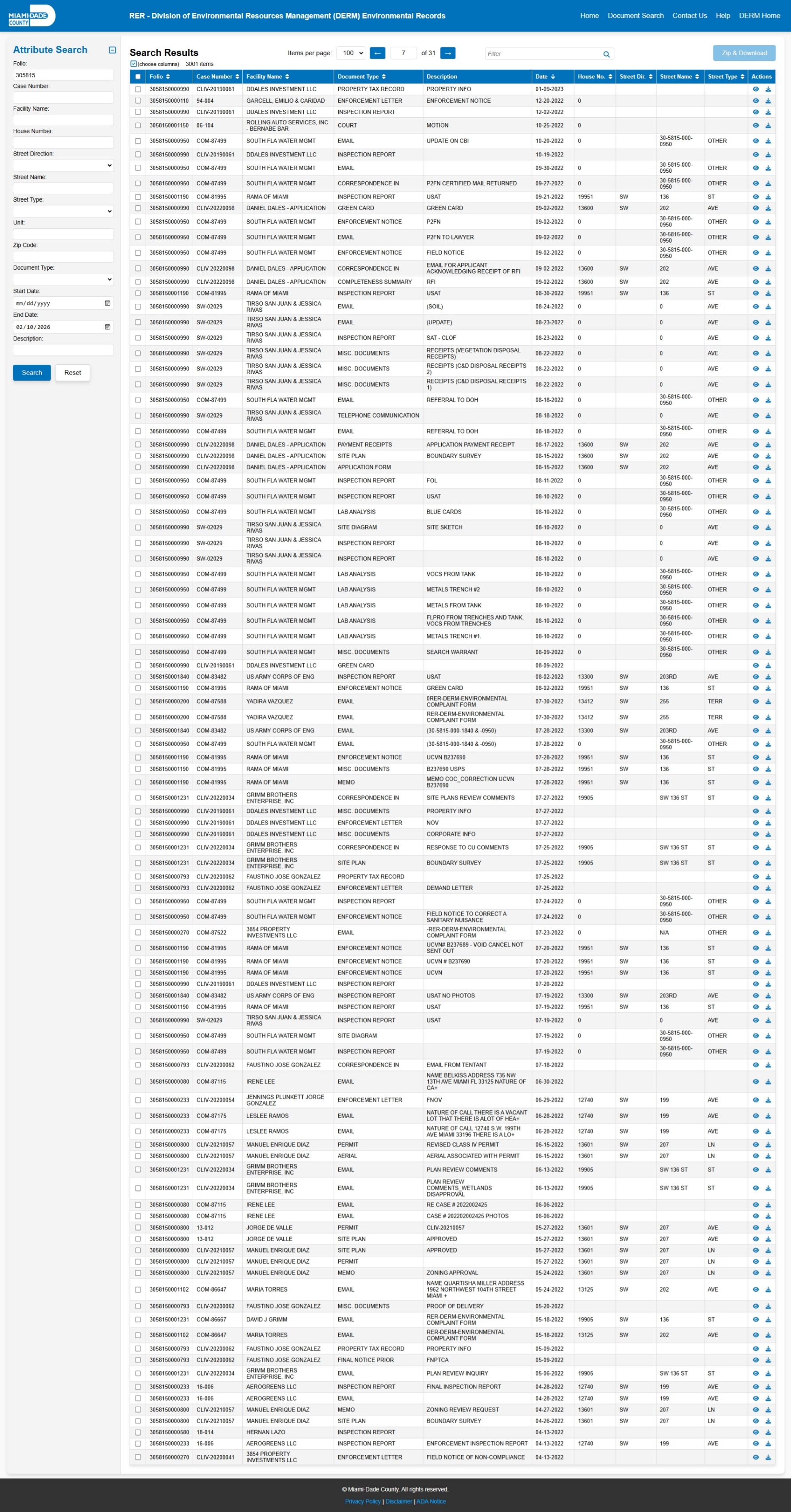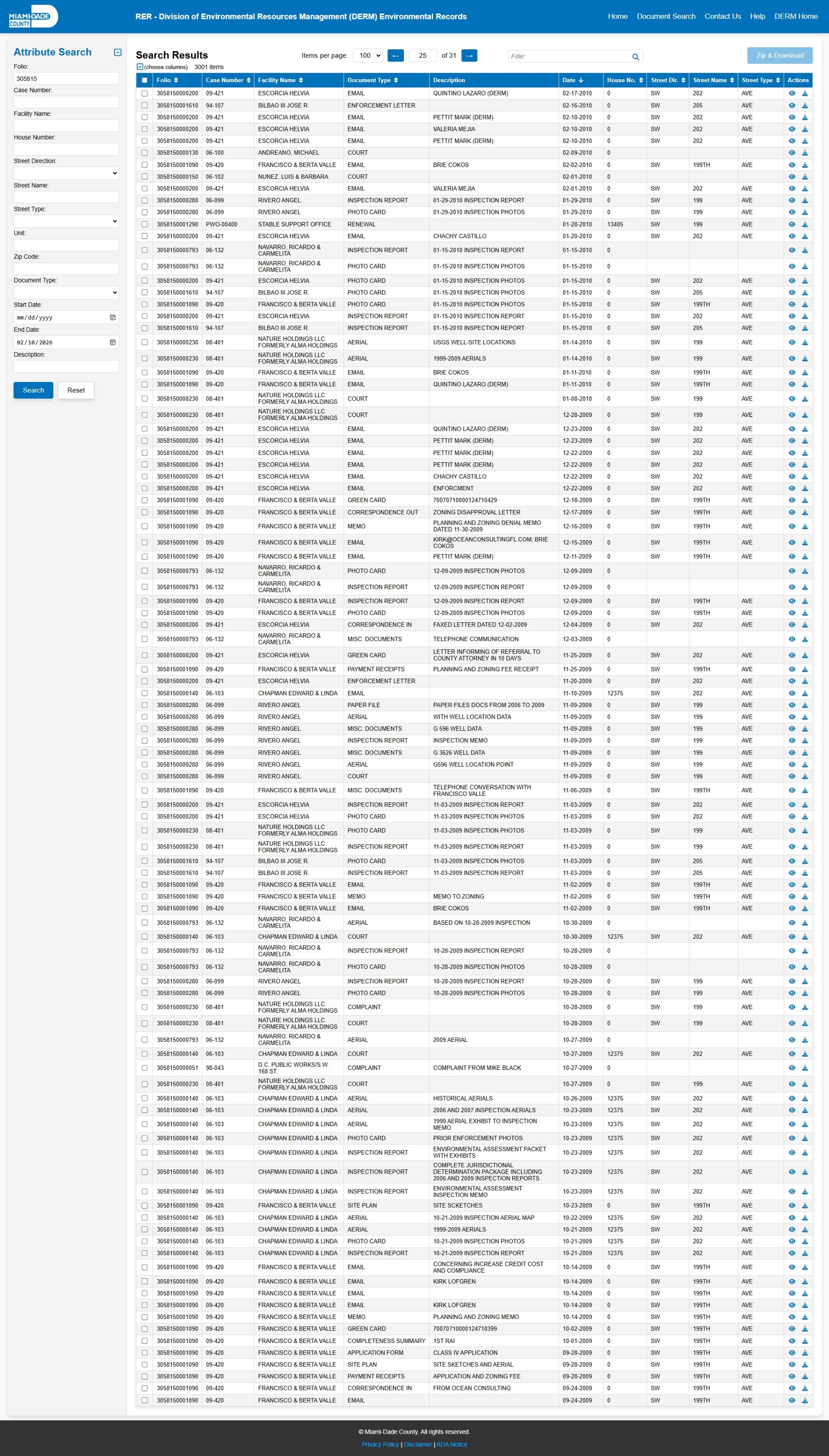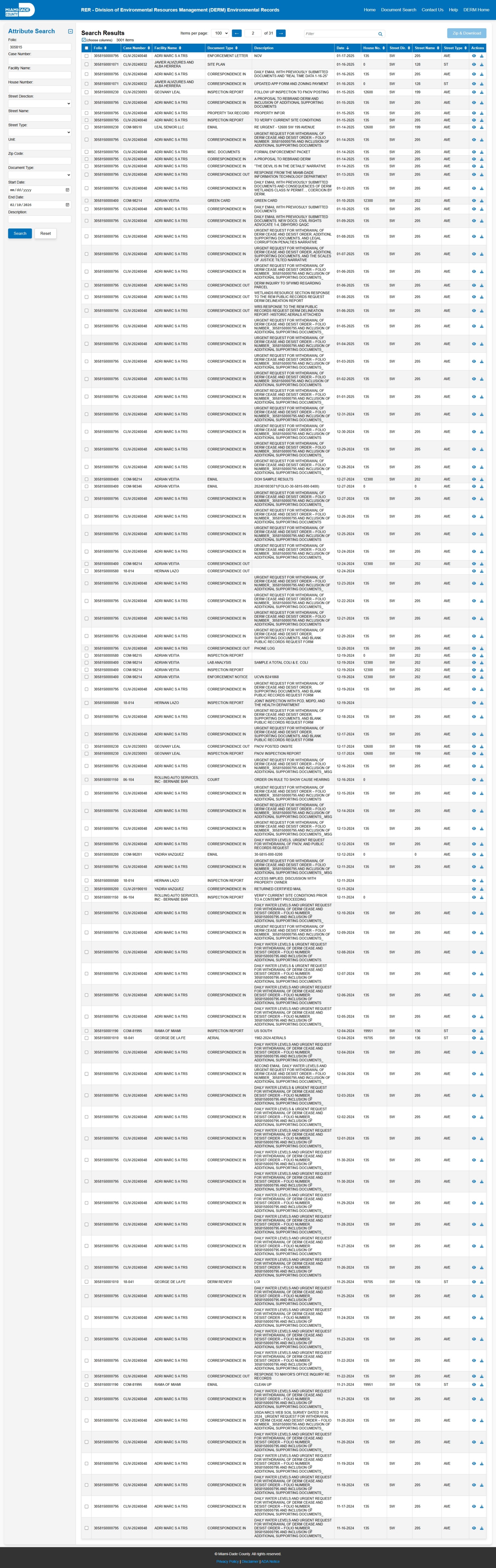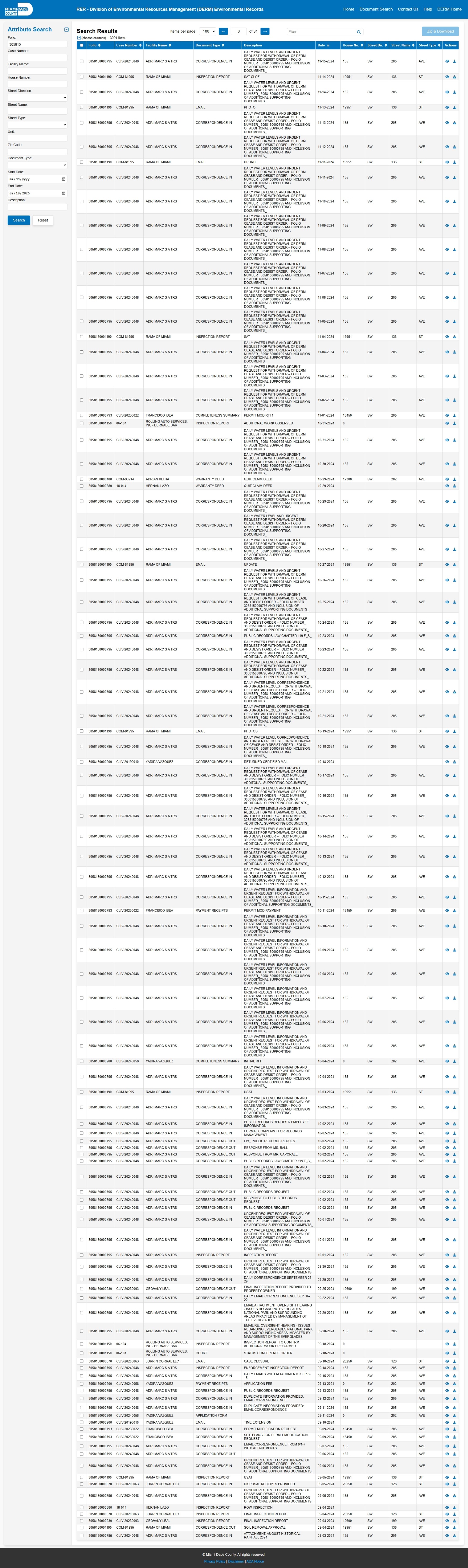 At the time of access, the DERM-RER portal represented the responsive record set as: