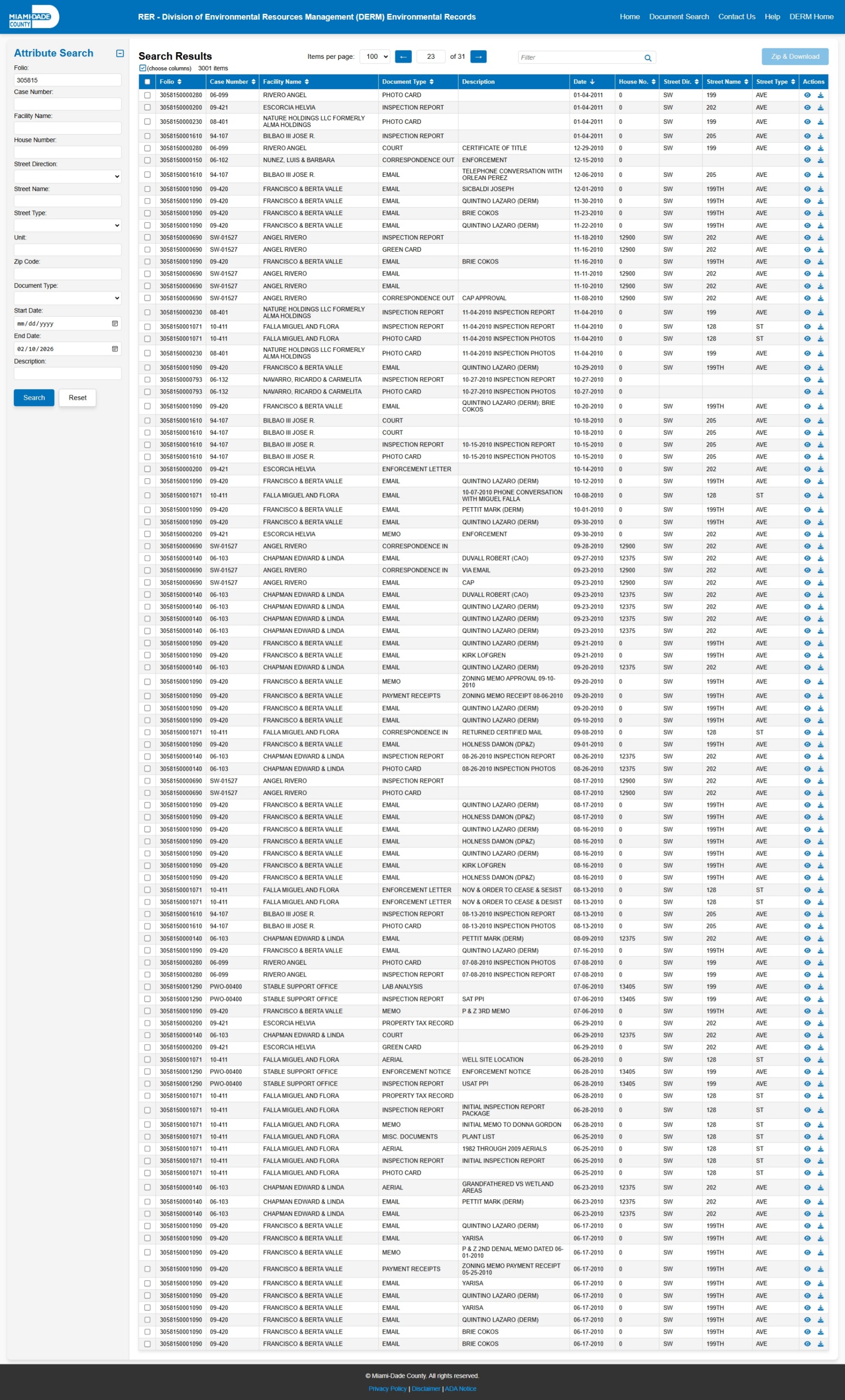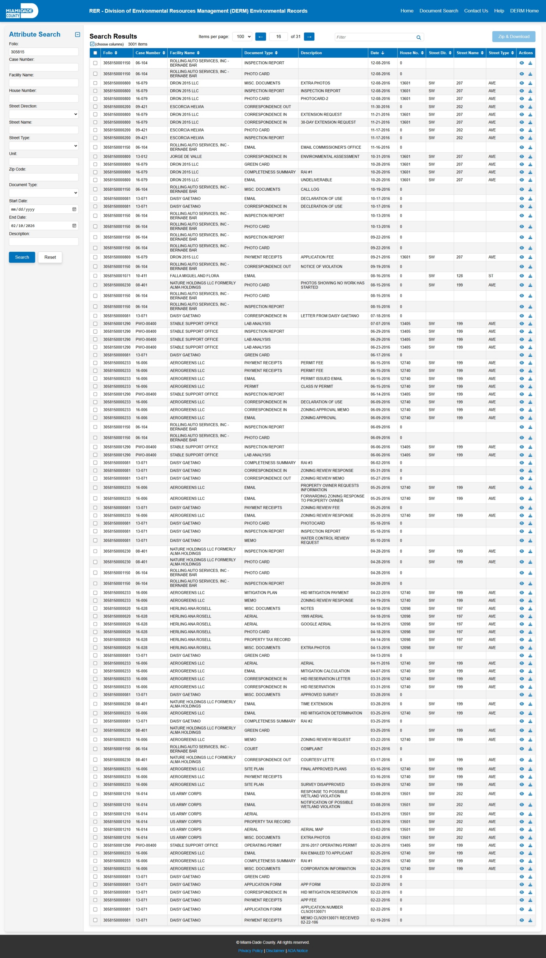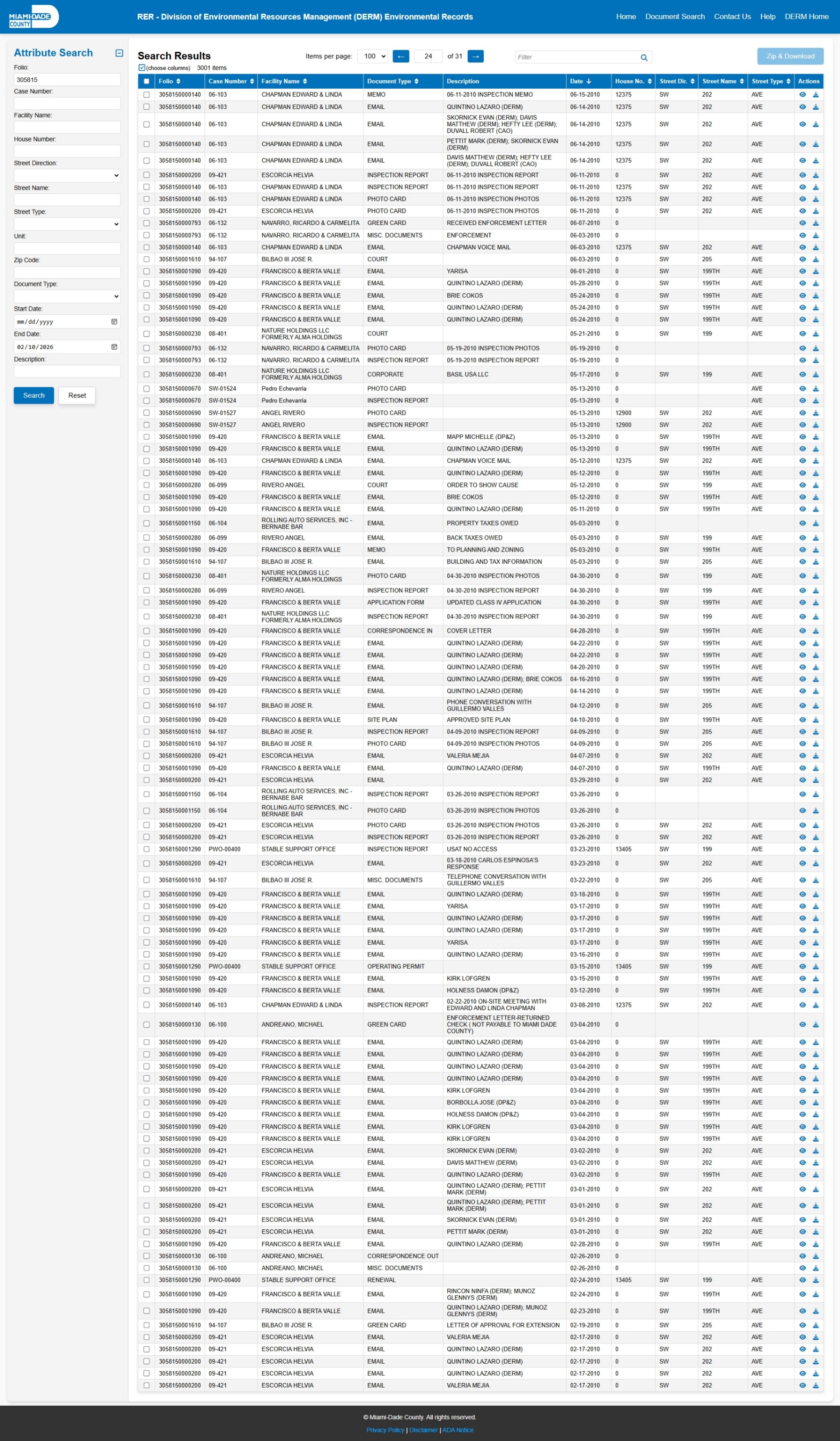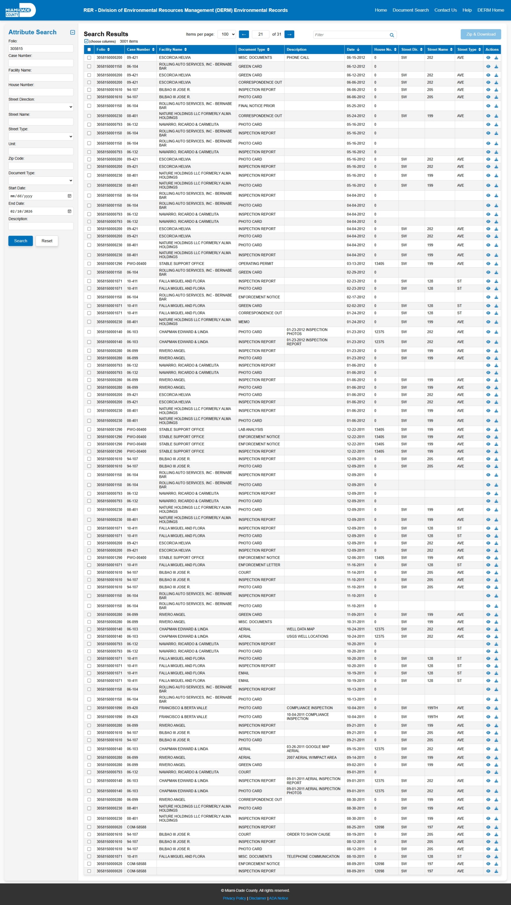 At the time of access, the DERM-RER portal represented the responsive record set as: