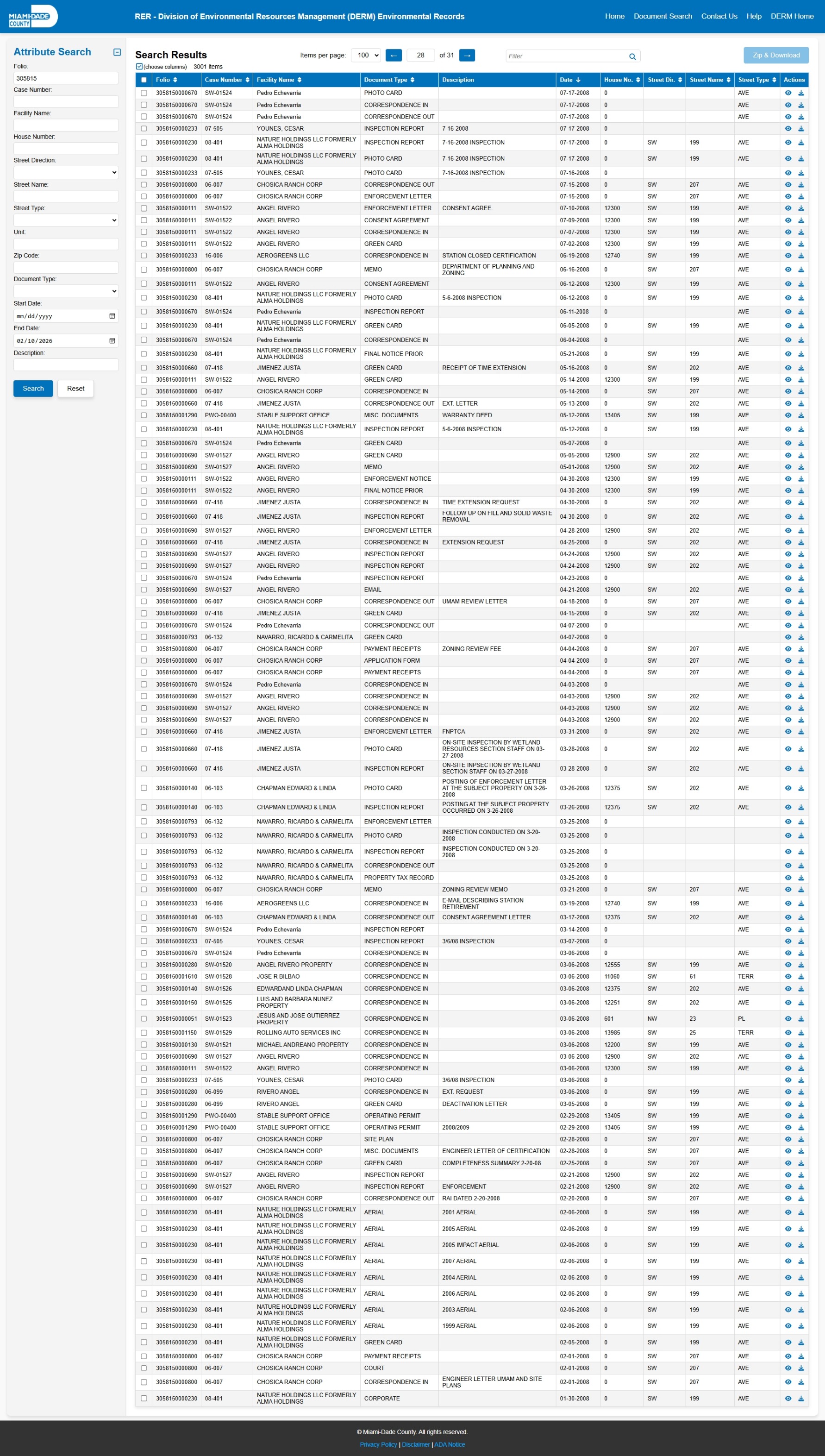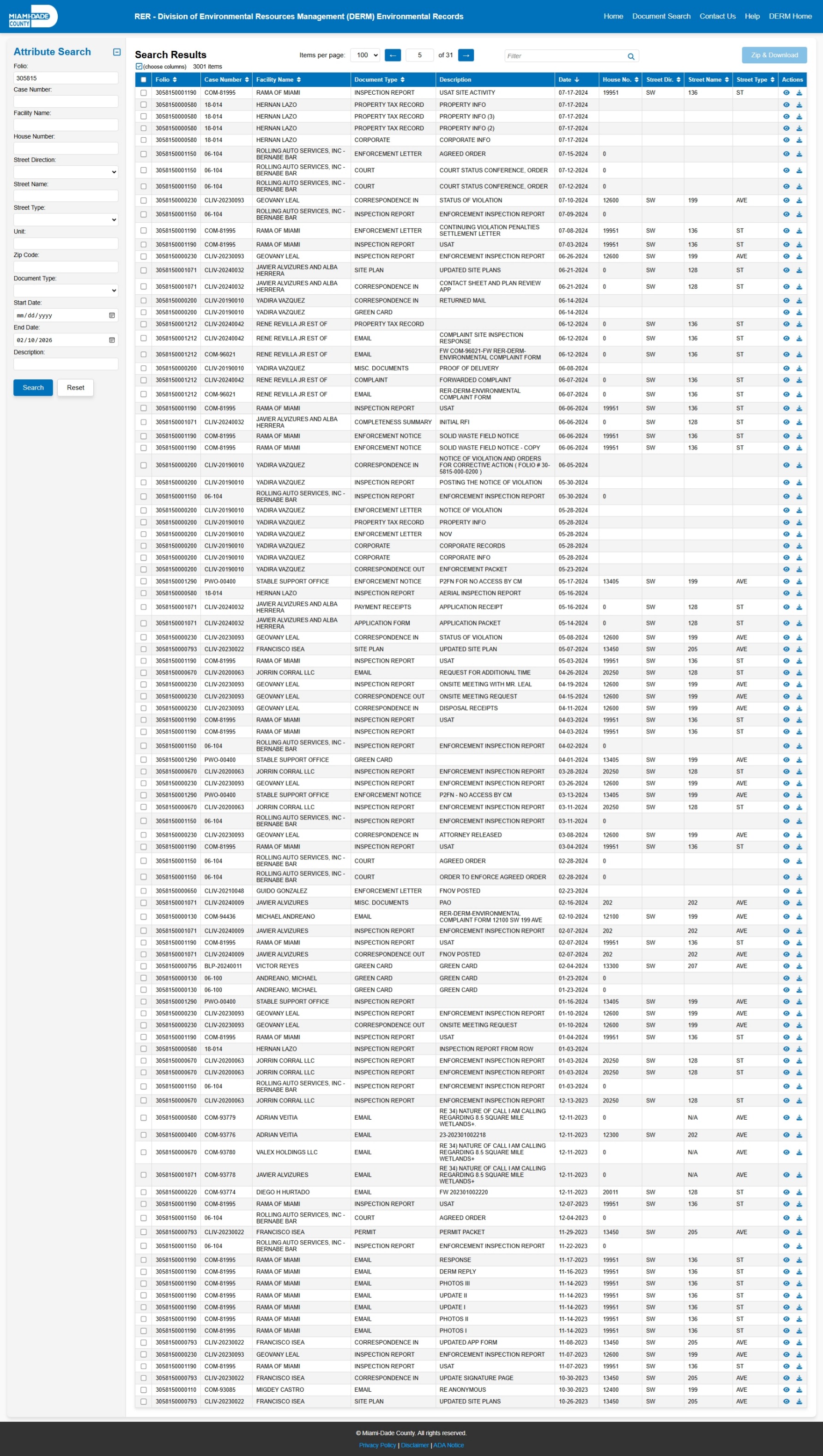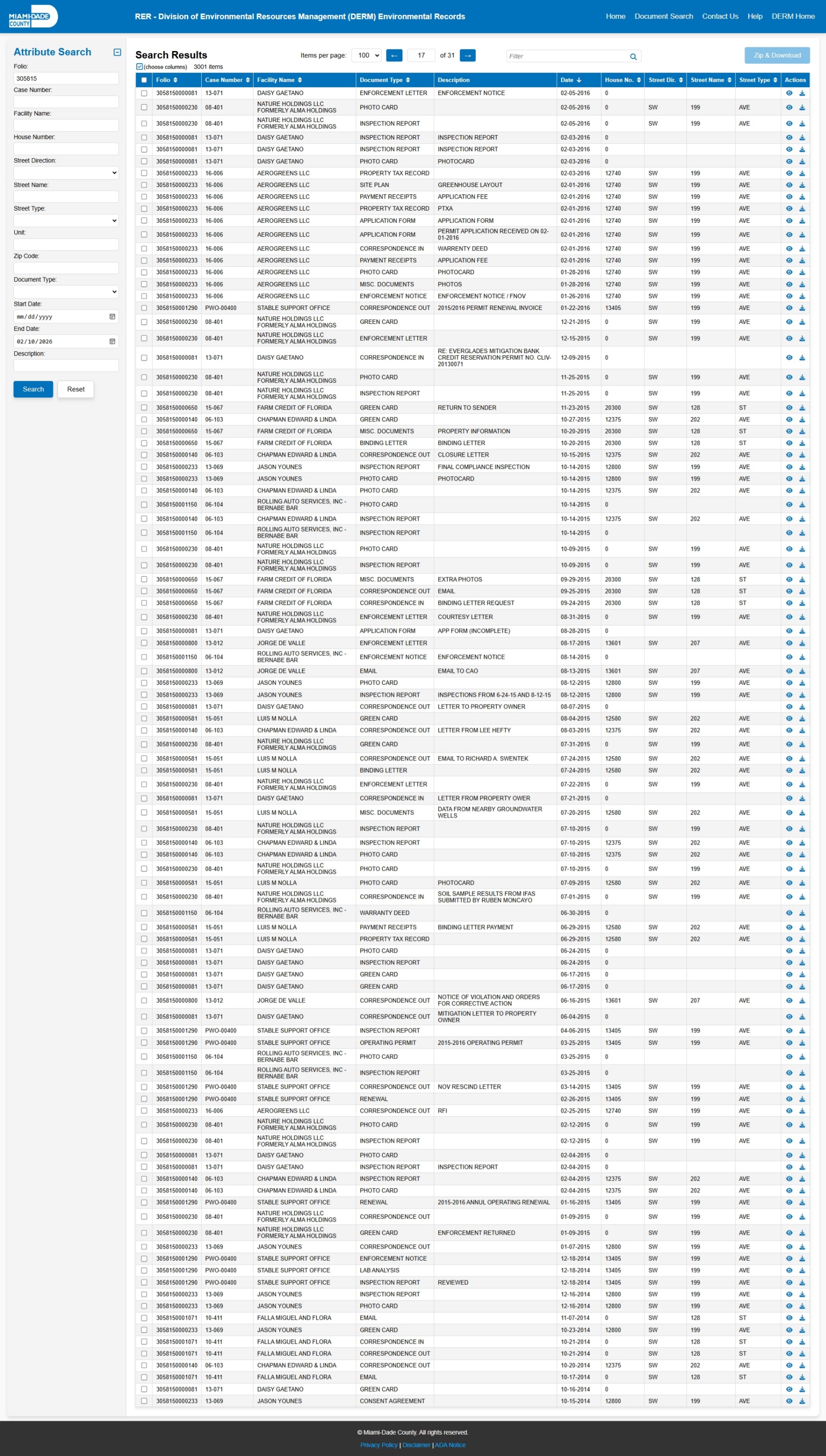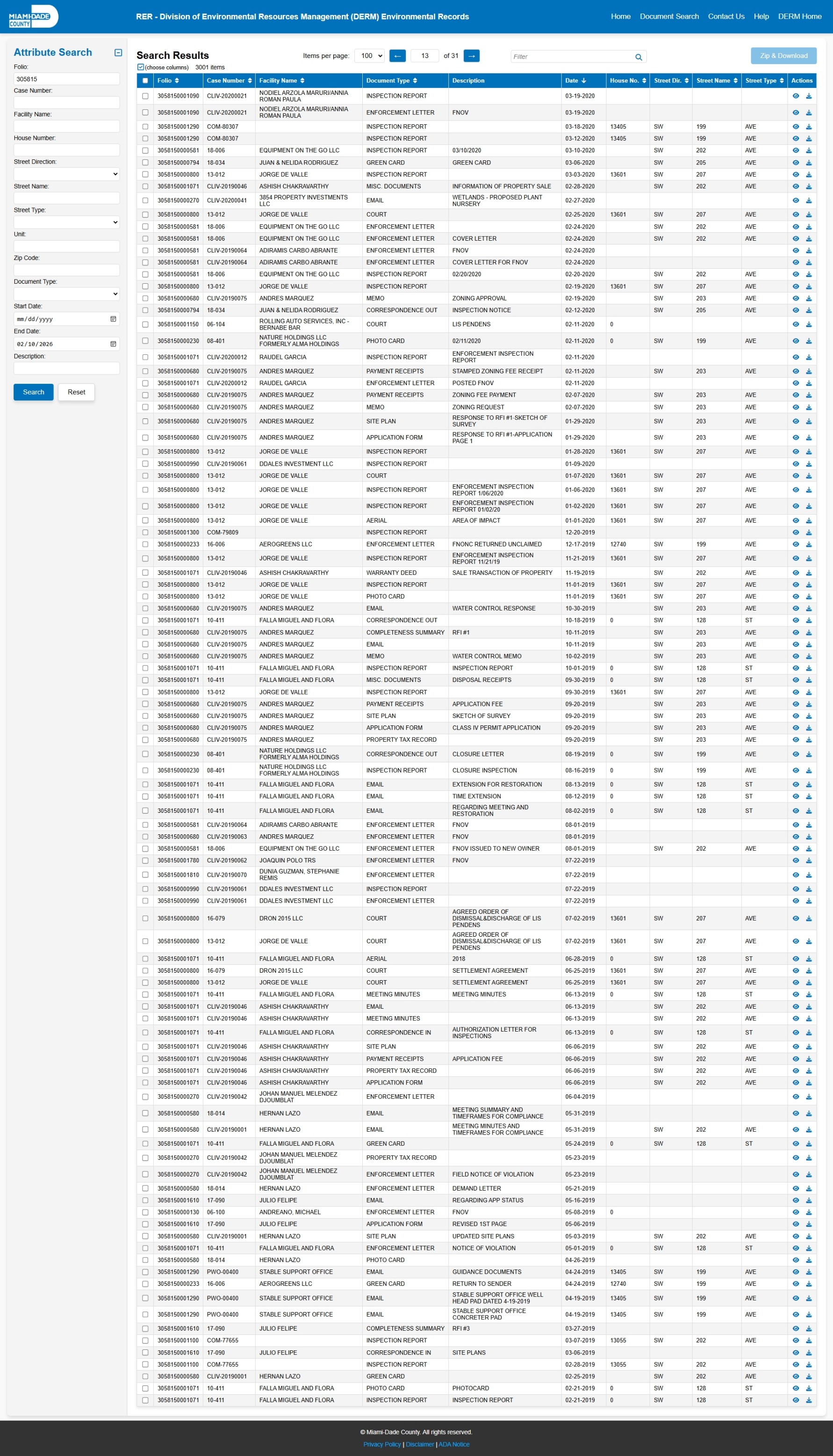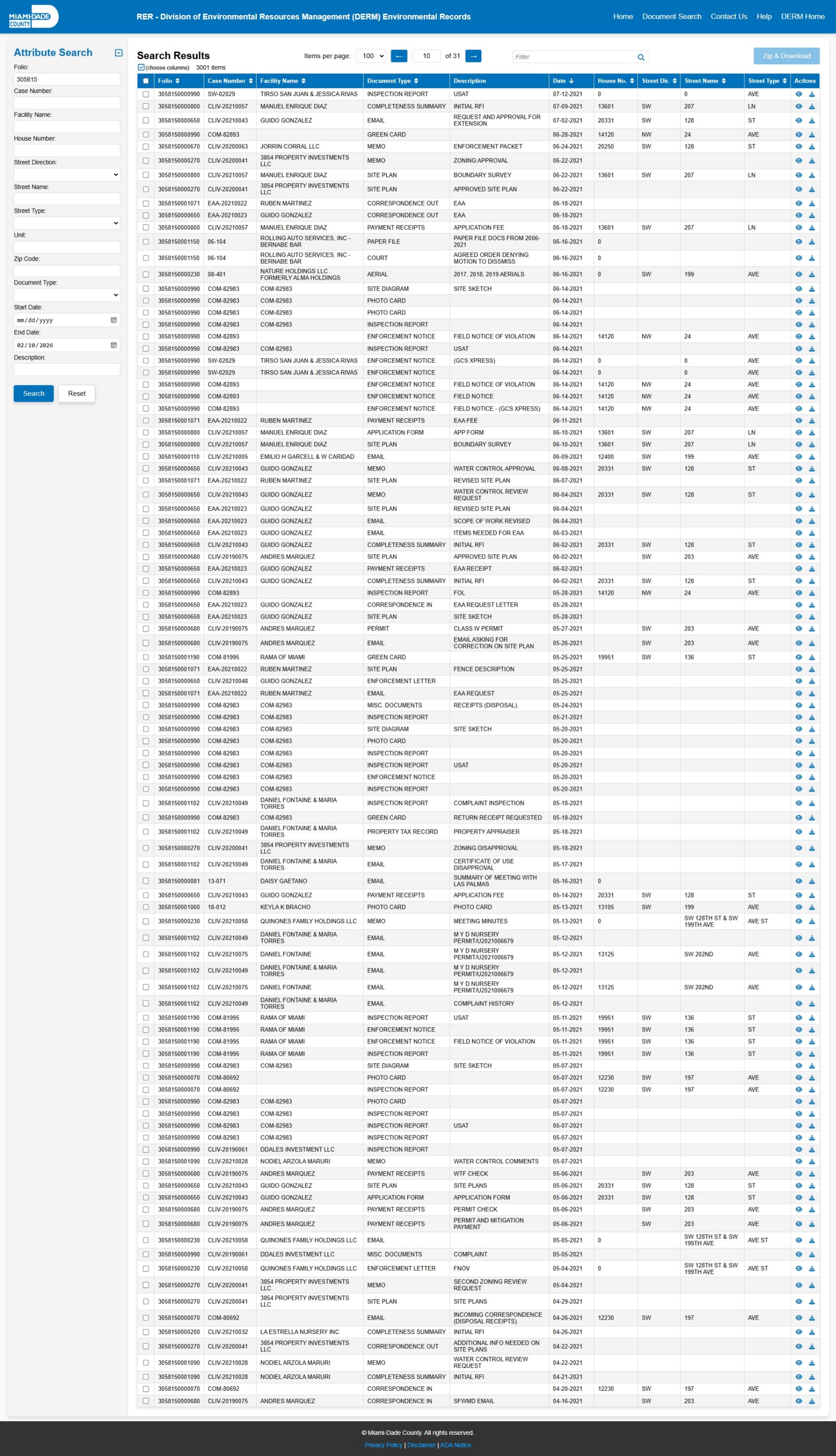 At the time of access, the DERM-RER portal represented the responsive record set as: