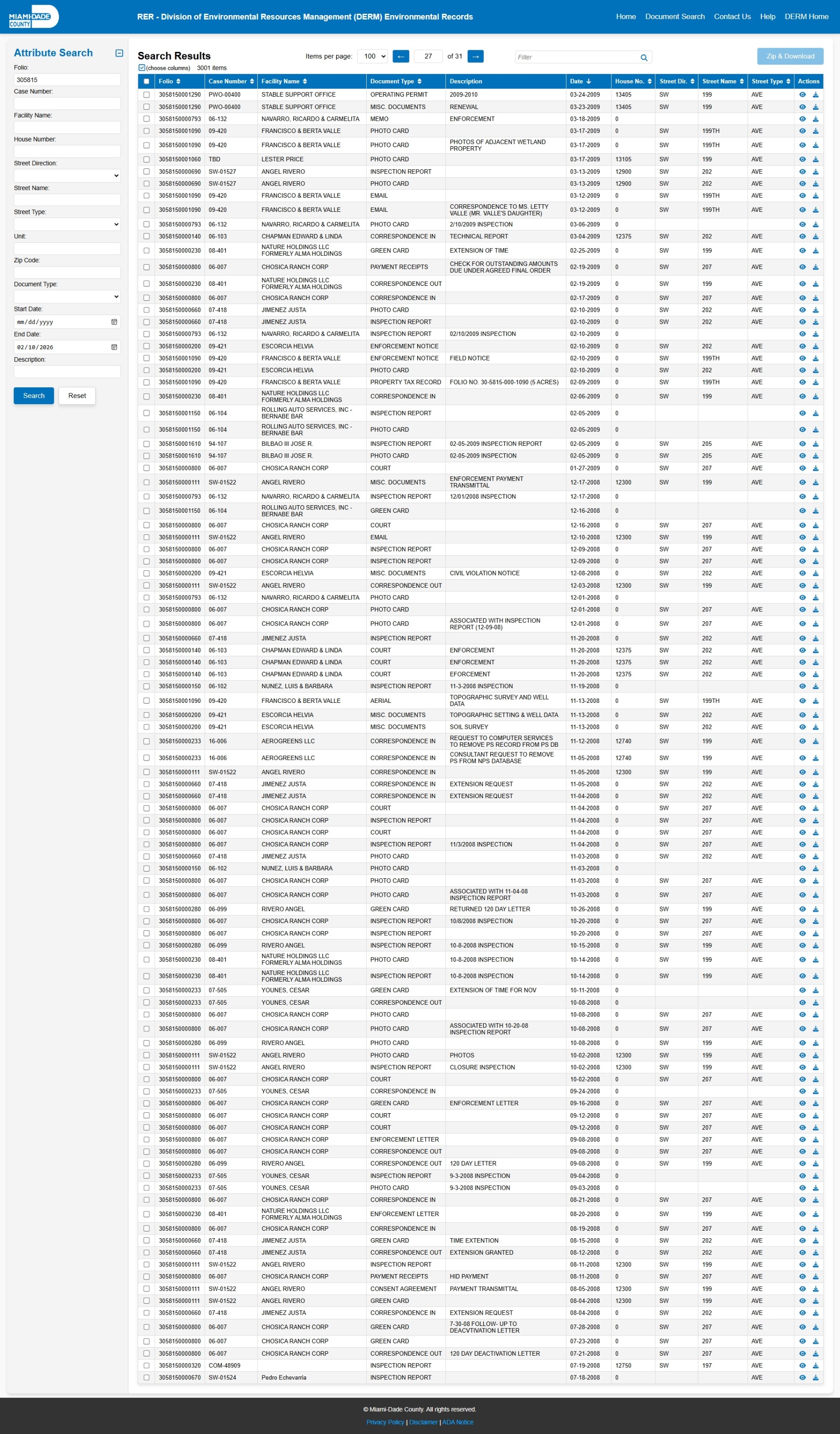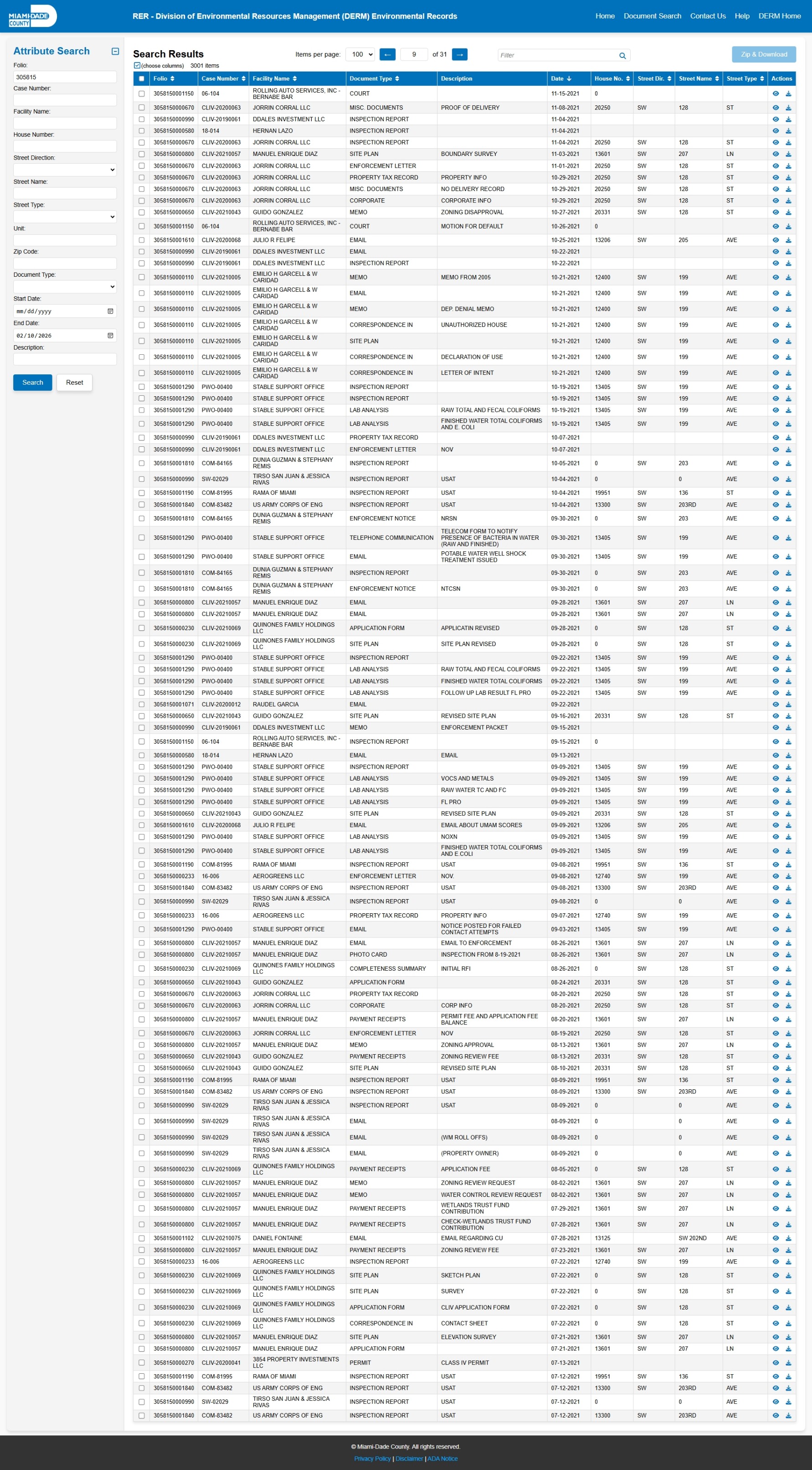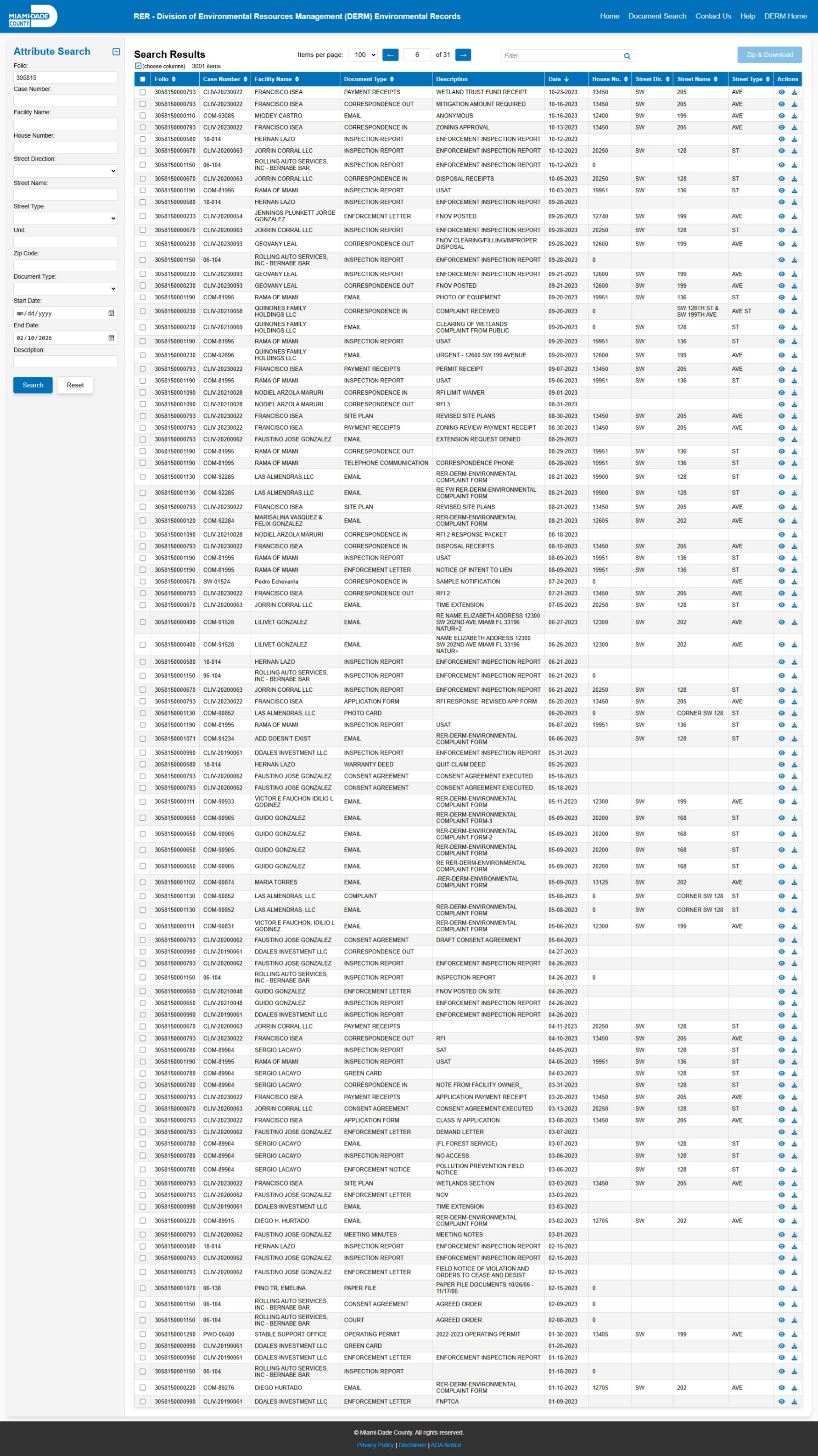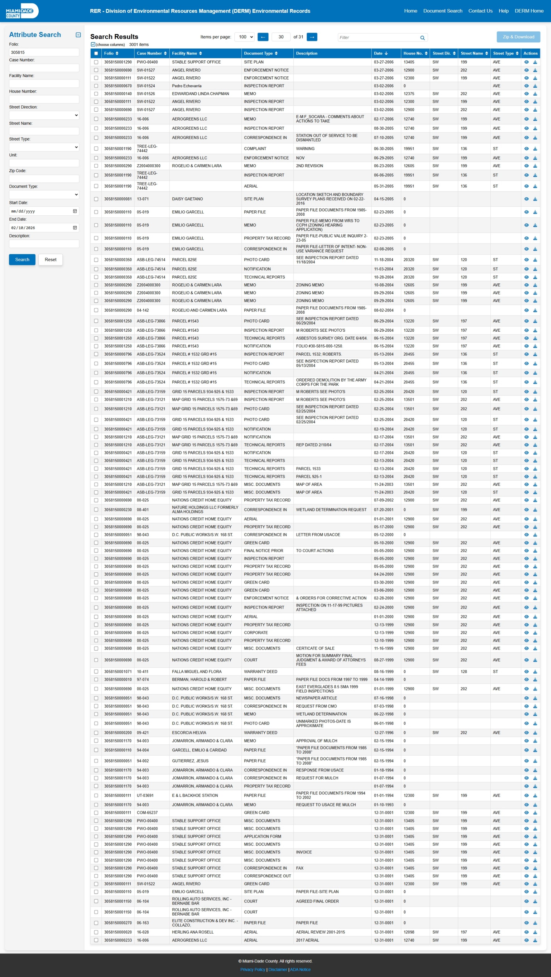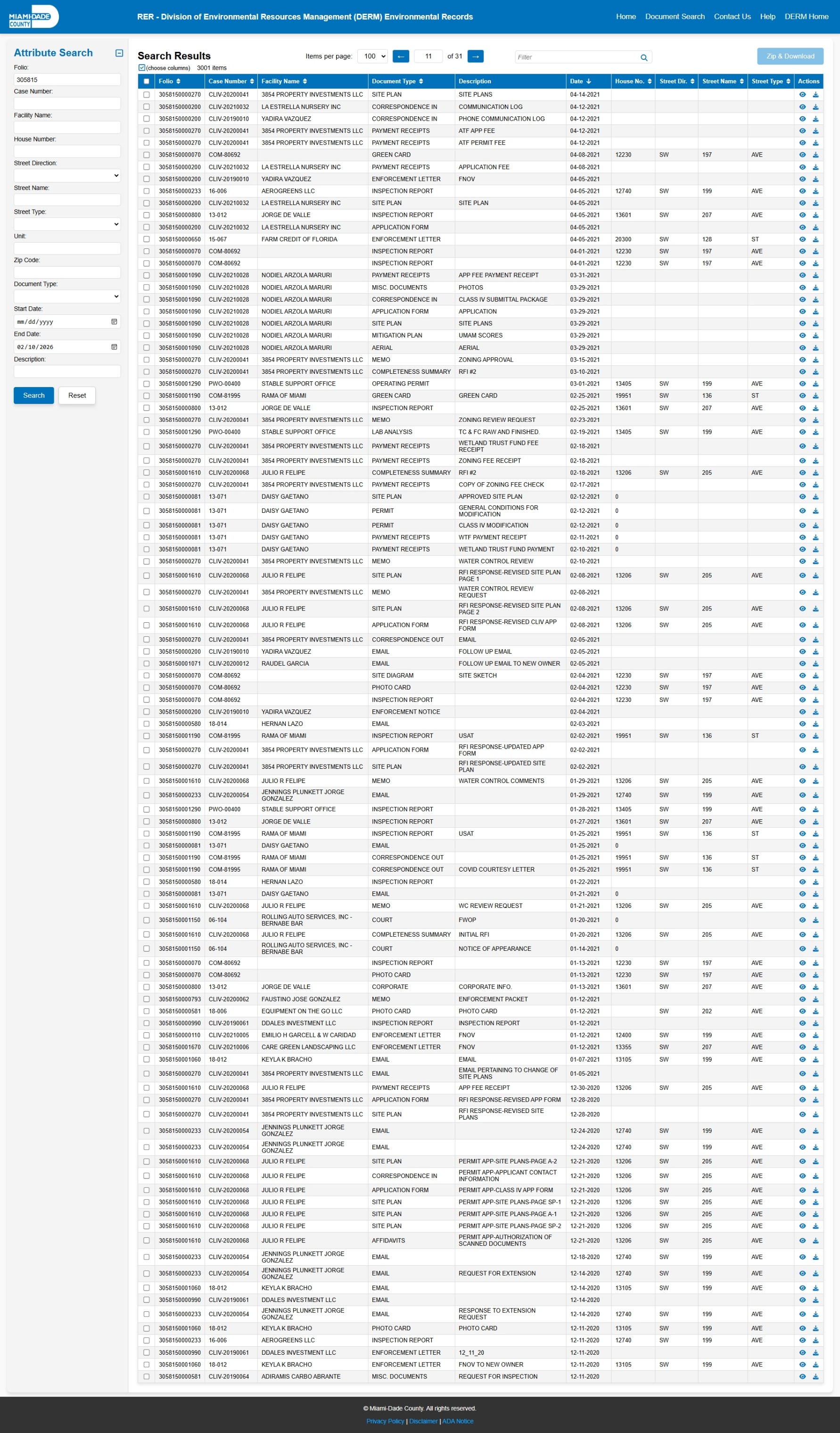 At the time of access, the DERM-RER portal represented the responsive record set as: